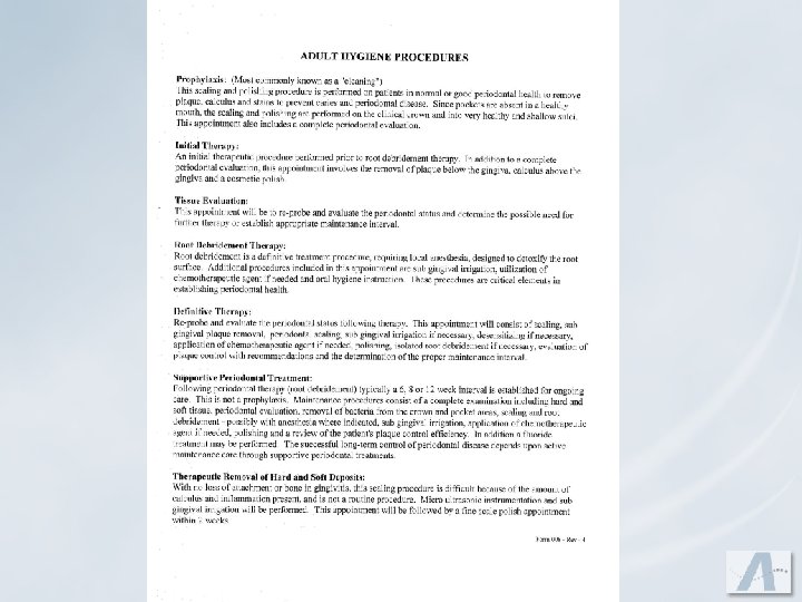 Supportive Periodontal Treatment u. Periodic maintenance treatment following periodontal therapy is not synonymous with a prophylaxis. u. Procedures: v. Complete periodontal probing – General fine scale v. Periodontal scale – Removal of subgingival plaque v. Treatment of 3 -4 isolated sites with root debridement incorporating anesthesia if necessary. (Laser practices will treat 2 -3 isolated sites and incorporate the utilization of the laser) v. Polish – Antimicrobial Irrigation – Desensitizing agent
