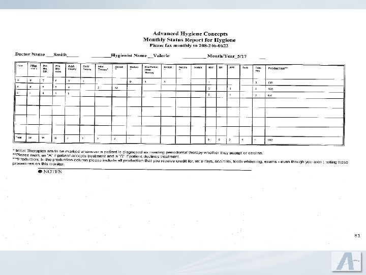 Effective Hygiene Scheduling u. Mix of procedures u. Daily Goal u. With multiple hygienists doctor exams need to be planned u. Appointments requiring periodontal chartings should not be planned at the same time u. Root debridements, Supportive periodontal treatment or Definitive therapies should be scheduled before lunch or at the end of the day.