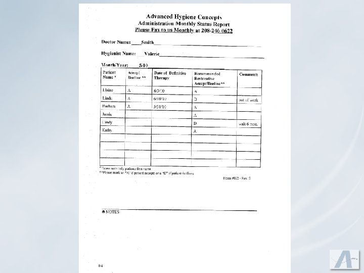 Hygienist’s Role u. Summarize when you are done with today’s appointment v. I know we gave you a lot of information today… v. Pamphlets or handouts v. Business card u. Walk patient to the front and summarize and hand-off to the front office personnel