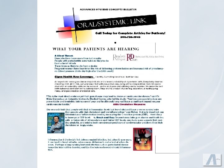 u It is evident that we can no longer view gingivitis simply as a precursor of periodontitis, but we should treat it as oral inflammation that needs to be controlled and eliminated for the overall well being of the individual. Ray C. Williams, DMD Chair, Department of Periodontology University of North Carolina School of Dentistry January, 2005 u “This is the most direct evidence yet that gum disease may lead to stroke or cardiovascular disease, ” said Dr. Moise Desvarieux at Columbia University Medical Center, who led the study. “And because gum infections are preventable and treatable, taking care of your oral health could very well have a significant impact on your cardiovascular health. ” AHA Circulation Magazine u There is growing evidence that chronic low-grade inflammation contributes to the development of many diseases, including Alzheimer's… Dr. Andrew Weil November 16, 2005