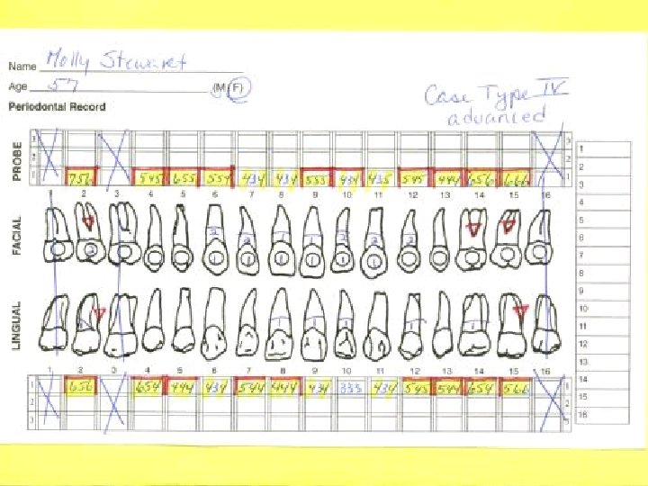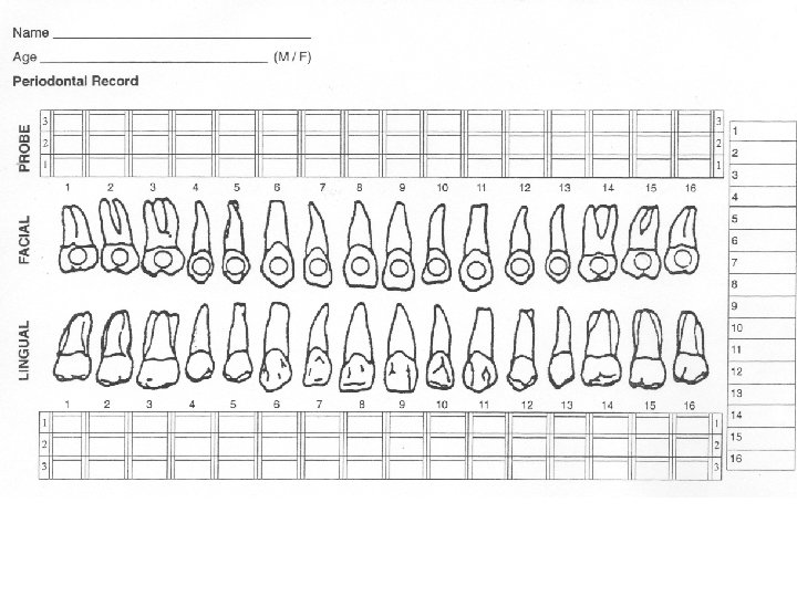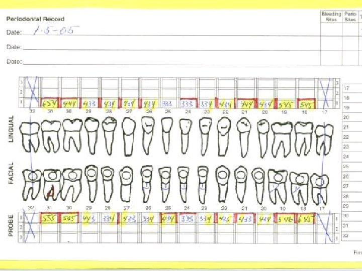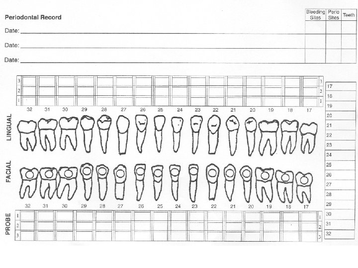Effective Periodontal Charting In 5 -7 Minutes u. Five recordings necessary to develop treatment plan. v. Pocket depths v. Bleeding v. Recession v. Furcations v. Mobility