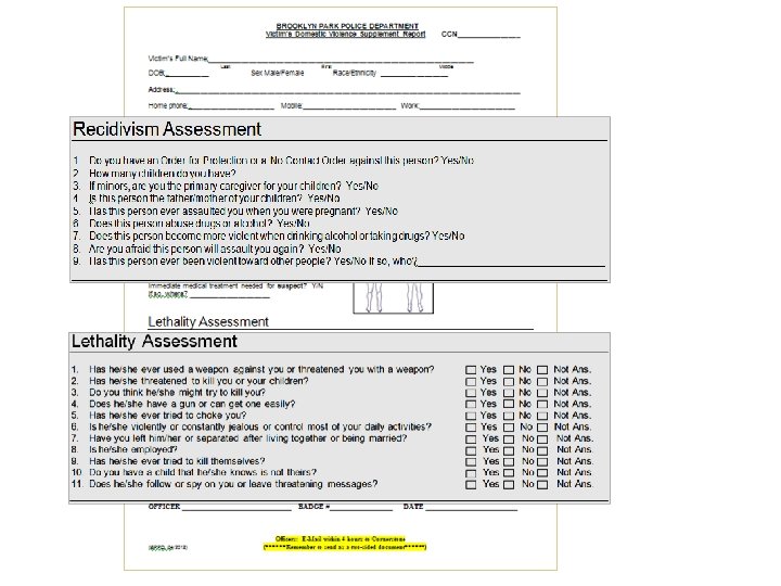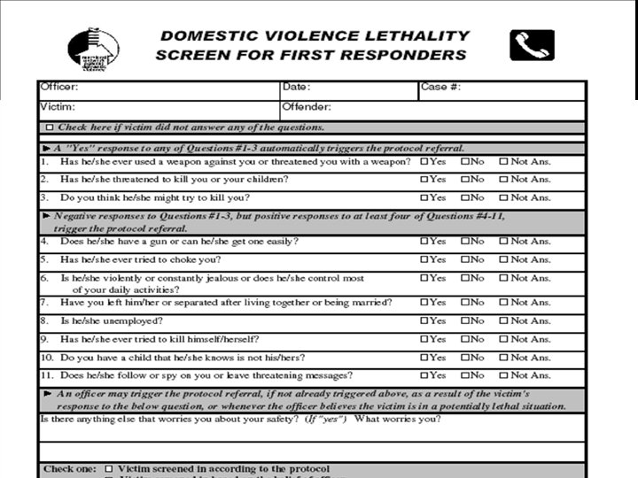 Why assess for lethality? • • • Reduces the likelihood of future harm to victims, officers, advocates and others Helps us recognize, understand quickly interpret risk factors Helps transfer information across disciplinary lines and fosters collaboration Creates a focused approach for criminal justice intervention A more effective management of police power Promotes effective case management