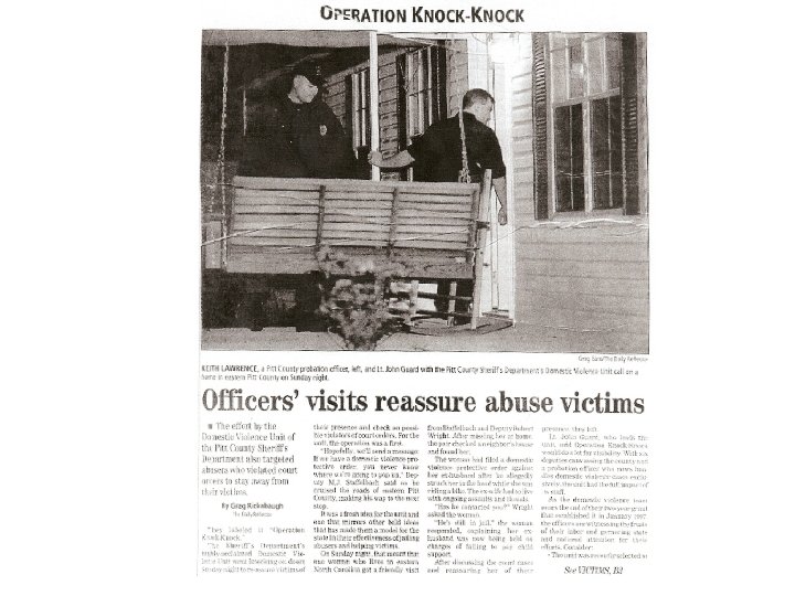 Knock & talk Ontario Domestic Assault Risk Assessment (ODARA) Score of 7+ Concerns from; Officer Advocate Attorney Probation Domestic Violence Coordinator Knock and Talks are performed weekly 1 -2 Officers And a Domestic Violence Prevention Coordinator