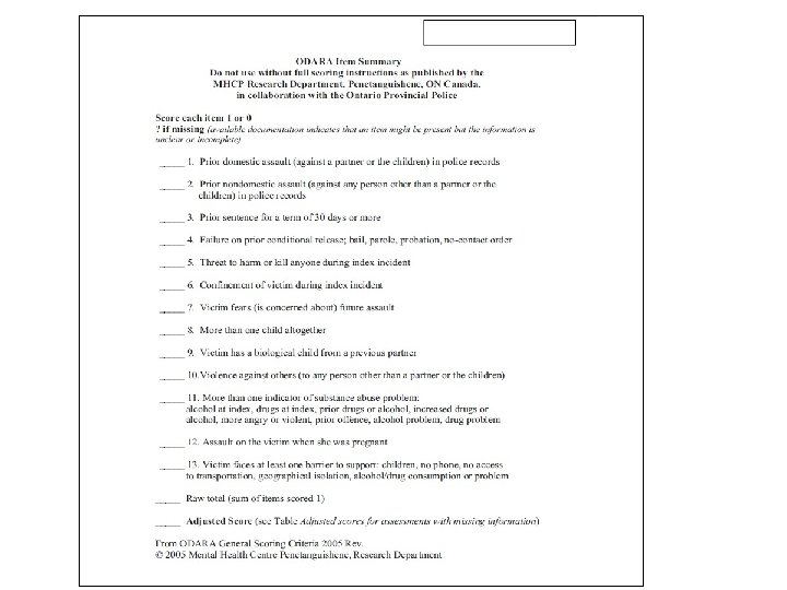 The Ontario Domestic Assault Risk Assessment (ODARA) Prior domestic incident Prior nondomestic incident Prior custodial sentence of 30 days or more Failure on prior conditional release Threat to harm or kill at the index assault Confinement of the partner Victim concern More than one child Victim’s biological child from a previous partner Substance abuse Assault on victim when pregnant Barriers to victim supported