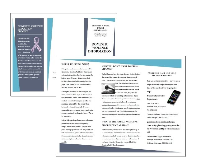 1. Target Immigrant and at Risk Populations Community Outreach Partner with Community Non-profit Organizations Partner with Community Cultural Liaison Community Response Unit - Youth Crime Watch Meetings National Night out Coffee with Cops Community Impact Domestic Violence Awareness Forums 2. Self Defense Classes 3. Citizen’s Academy 4. DV Project Pamphlets 5. Park Pages – BP Website