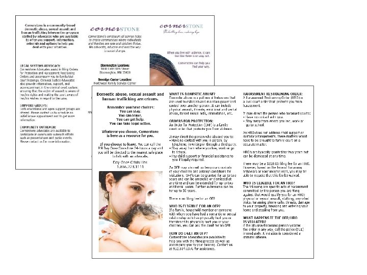 Collaborating Partners with Cornerstone Advocacy 2 full time Advocates housed in the police department Services provided to victim • • Safety Planning Legal System Advocacy – Court Support and a Liaison between victims and prosecutors Other service provided and offered by organization • • • Support and Educational Parenting Support Therapy Housing Resources Rape and Sexual Abuse Services Advocacy