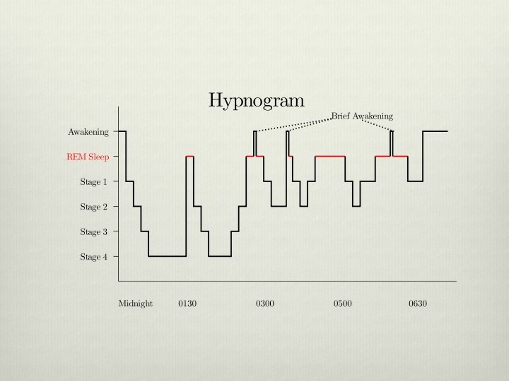 RESULTS/ FINDINGS v The REM periods occurred quite frequently during the night average every 92 minutes. v Awakenings during the night: HOURS % First 2 hours 21 Second 2 hours 29 Third 2 hours 28 Fourth 2 hours 22 Despite the awakenings, sleep was similar to uninterrupted sleep.