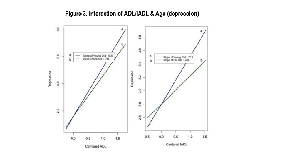RESULTS • Second, there is a significant moderating effect of age; it is surprising that the ‘old-old’ persons with high functional limitations are less depressed and less anxious than their younger counterparts. Initially, it was expected that the old-old persons with high functional limitations will be more depressed and more anxious, but there may be a number of explanations for this different outcome (Figure 3 and Figure 4). • Surprisingly, older age had a buffering effect on the relationship between functional limitations and mental health.