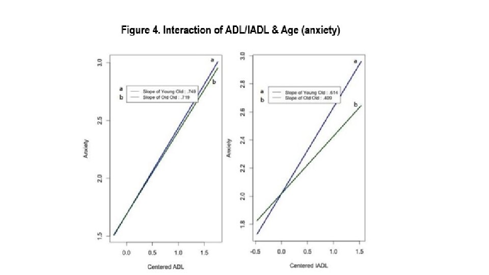 § To examine the relationship of ADL/IADL and depression/anxiety, controlling for sociodemographic factors, multiple regression models were performed. § Also, multiple regression analyses were conducted to examine the hypothesis that age has a moderating influence on the association between functional ability and depression/anxiety (Figure 2). § Figure 2. Research Model
