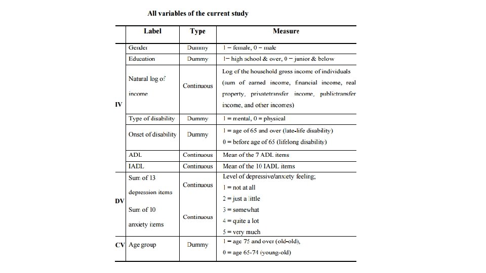 Theories § Research questions on the relationship between functional limitation on mental health of older Koreans with disabilities and the moderating effects of age are based on § Lazarus and Folkman’s (1984) ‘Transactional Model of Stress’ § Havighurst’s (1961) ‘Activity Theory. ’