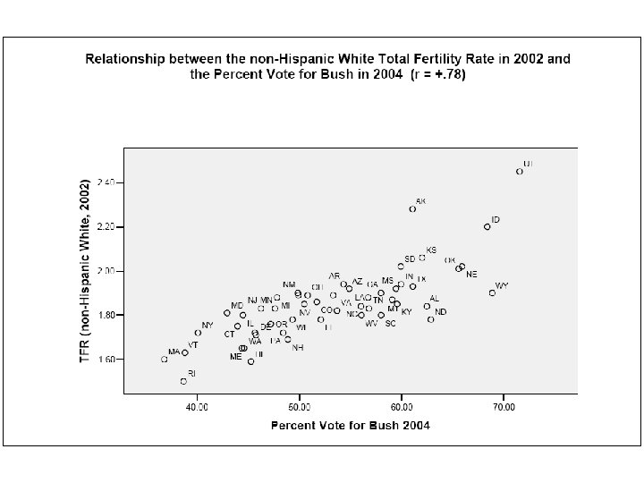 Political Fallout: the 2004 US Election In terms of fertility rates the red states had a 12 point advantage over the blue states in 2004…among white Americans fertility differences reflect a gulf between the religious and the secular. In largely Mormon Utah, there are 90 children for every 1, 000 women of child-bearing age, compared to only 49 in the socially liberal Vermont of Howard Dean…Bush won a majority in 2000 in states with above-replacement levels of 2. 11 children per woman, while the Gore-Kerry states looked like Europe, with a below-replacement fertility rate. Retro America is outbreeding metro America – journalist Michael Lind, January 2005