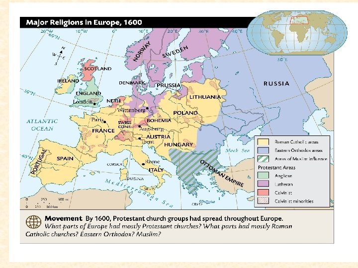 Reformation • Luther’s thesis began to circulate, and the church broke off into 2 parts: Protestants and Catholics