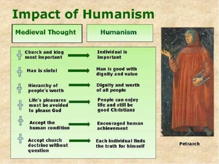 Deep Thinking and Humanism • Renaissance thinkers encouraged adventure to new worlds and more observation of space – New art forms and a belief that man can do anything • HUMANISM began, study of Greece and Rome to understand their own times – Where Christians focused on worldly subjects instead of religious subjects – Belief that education should stimulate the individual’s creative powers – HUMANITIES studies were emphasized, study of grammar, rhetoric (effective language), poetry and history