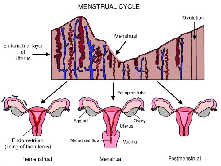 Stages of Menstruation Preovulatory Phase: n Begins as soon as menstrual bleeding from the previous cycle has ended; endometrium thickens Ovulation n Takes place around the midpoint of the cycle (14 -16 days before the 1 st day of the menstrual flow) Postovulatory Phase n Progesterone causes the endometrium to thicken Menstrual Phase n Menstruation occurs, uterine lining is discharged