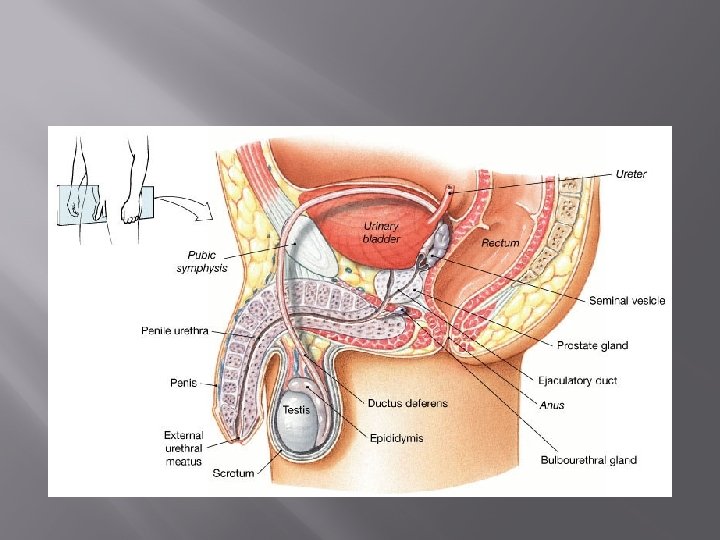 Duct System � � Vas deferens (ductus deferens) – runs upward from epididymis into pelvic cavity and arches over bladder and empties into the ejaculatory duct to merge with the urethra. Vasectomy – surgeon makes an incision in the scrotum and cauterizes the vas deferens. Sperm are still produced but can no longer reach the exterior of the body.