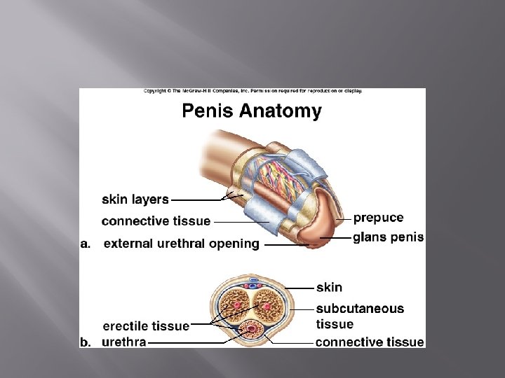 Male external genitalia 2. Penis – designed to deliver sperm into female reproductive tract � shaft – makes up majority of penis � glans penis – enlarged tip of the shaft � prepuce (foreskin) – cuff of skin around proximal end of the glans penis (removed during circumcision) � erectile tissue – spongy tissue that fills with blood during sexual excitement causes penis to enlarge and become rigid (erection)