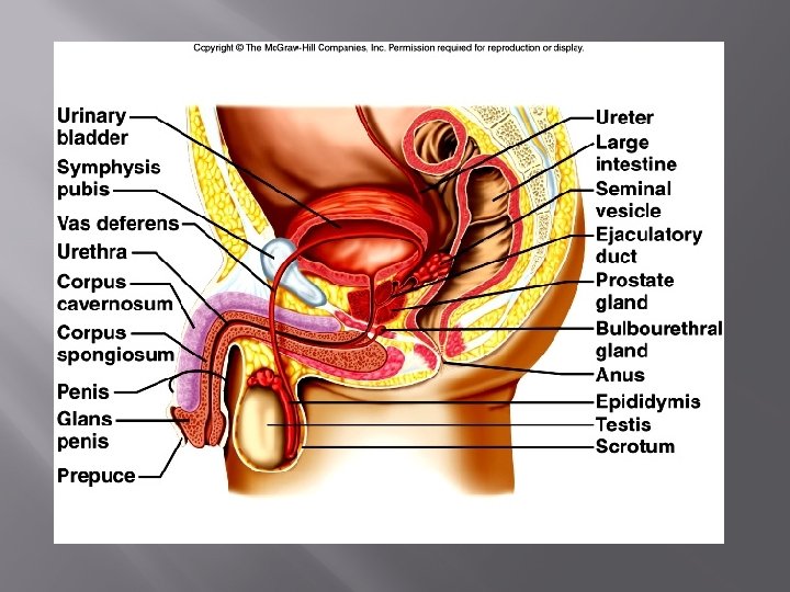 Accessory Glands 3. Bulbourethral Glands – pea-sized glands inferior to prostate gland; produce a thick, clear mucus that drains into urethra �This secretion is the first to pass down the urethra during sexual excitement cleanses urethra of acidic urine and acts as a lubricant during intercourse