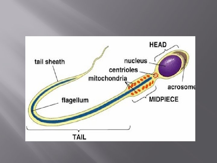 Spermatogenesis – production of sperm � A man makes millions of sperm each day � There are 3 regions of a mature sperm: v Head – contains DNA v Midpiece – contain mitochondria ATP v Tail – means of propelling itself Acrosome – helmetlike structure anterior to head – breaks down and releases enzymes as sperm approaches egg. Enzymes help sperm penetrate egg �
