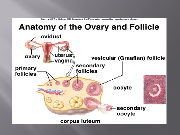 Anatomy of the Female Reproductive System � � More complex role than of males. A female must be able to produce female gametes (ova) and nuture and protect a developing fetus for 9 months Ovaries – paired structures the size and shape of almonds � Many ovarian follicles, each of which consists of an immature egg or oocyte � Oocyte matures and is ejected from ovary in a event called ovulation