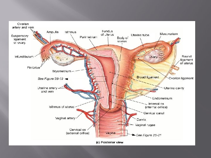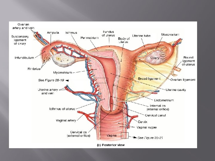 Female Duct System 2. Uterus – located between bladder and rectum, the uterus is hollow that functions to receive, retain, an nourish a fertilized egg. � normally, about size of a pear � made up of body, fundus (superior rounded region), and cervix (outlet to the vagina) � 3 layers of mucosa line walls of uterus Endometrium – inner layer; provides soft place in which embryo to develop Myometrium – middle layer; contracts to force baby out during labor Perimetrium – outermost layer of uterus (deepest layer)