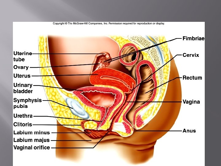 Female Duct System 3. Vagina – thin-walled tube 8 – 10 cm long; lies between the bladder and rectum and extends from cervix to exterior of body. provides a passageway for menstruation and for delivery of infant • female organ of copulation • Hymen – thin fold of mucosa that partially closes vaginal opening; very vascular and tends to bleed during first intercourse •