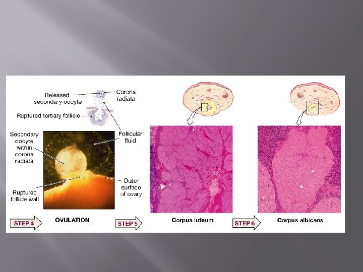 3. Corpus Luteum Stage � � � After ovulation, LH stimulates the cells of the ruptured follicle to divide and develop into a mass of reddish-yellow cells called the corpus luteum. Progesterone is secreted by the corpus luteum and helps to maintain the thickening of the endometrium (should fertilization occur). This stage lasts about 14 days.
