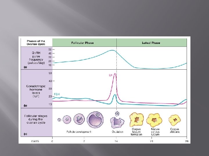 4. Menstruation Stage � � � If fertilization does not take place, the corpus luteum breaks down which causes a decrease in progesterone levels. The lining of the endometrium becomes progressively thinner and eventually breaks down. The extra layers of the endometrium, the unfertilized egg, and blood that results when the endometrium pulls away from the uterus are discharged through the vagina. This menstruation stage begins around day 28 of the cycle and lasts 3 -7 days. While this is occurring, estrogen levels decrease and the anterior pituitary secretes FSH which stimulates the growth of a new follicle and the cycle begins again.