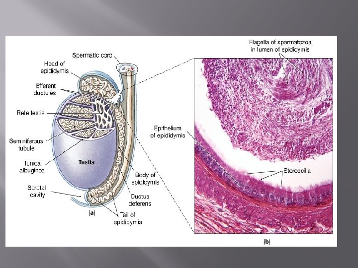 Duct System � � � Epididymis - a comma-shaped, highly coiled tube about 20 feet long that sits atop the superior part of the testis and receives the sperm produced by seminiferous tubules. Sperm mature and gain the ability to swim as they make their way through the epididymis (takes about 20 days) When sexually stimulated, walls of the epididymis contract to expel sperm into the vas deferens (ductus deferens)