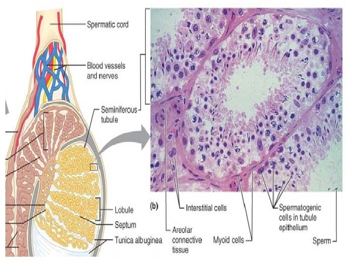 The Testes Each testis is approximately 4 cm (1. 5 inches) long and 2. 5 cm (1 inch) in width and is surrounded by the tunica albuginea , the fibrous capsule of the testis. Septa extending from the tunica albuginea divide the testis into 250 to 300 wedge-shaped lobules , each containing one to four tightly coiled seminiferous tubules, the actual “sperm factories. ” Surrounding each seminiferous tubule are smooth muscle cells. By contracting rhythmically, these muscles squeeze sperm and testicular fluids through the tubules and out of the testes.