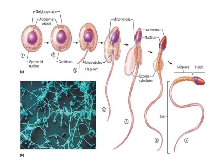 Meiosis: Spermatocytes to Spermatids Each primary spermatocyte generated during the first phase undergoes meiosis I, forming two smaller haploid cells called secondary spermatocytes. The secondary spermatocytes continue on rapidly into meiosis II, and their daughter cells, called spermatids. Spermiogenesis: Spermatids to Sperm Each spermatid has the correct chromosomal number for fertilization (n), but is nonmotile. It still must undergo a process called spermiogenesis, during which it elongates, sheds its excess cytoplasmic baggage, and forms a tail. The resulting sperm, or spermatozoon has a head, a midpiece, and a tail.