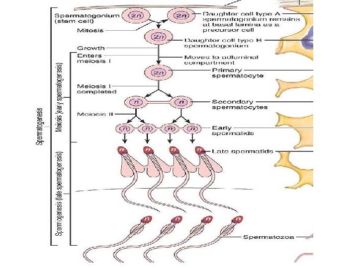 Mitosis of Spermatogonia: Forming Spermatocytes The outermost tubule cells are stem cells called spermatogonia. -The spermatogonia divide more or less continuously by mitosis and, until puberty, all their daughter cells become spermatogonia. - Spermatogenesis begins during puberty, and from then on, each mitotic division of a spermatogonium results in two distinctive daughter cells–types A and B. The type A daughter cell remains at the basement membrane to maintain the germ cell line. -The type B cell gets pushed toward the lumen, where it becomes a primary spermatocyte destined to produce four sperms.