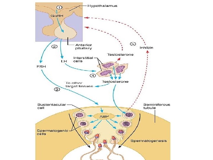 Hormonal Regulation of Male Reproductive Function The Brain-Testicular Axis Hormonal regulation of spermatogenesis and testicular androgen production involves interactions between the hypothalamus, anterior pituitary gland, and testes, a relationship sometimes called the brain-testicular axis. The hypothalamus releases gonadotropin-releasing hormone (Gn. RH), which controls the release of the two anterior pituitary gonadotropins: folliclestimulating hormone (FSH) and luteinizing hormone (LH). (Both FSH and LH were named for their effects on the female gonad).