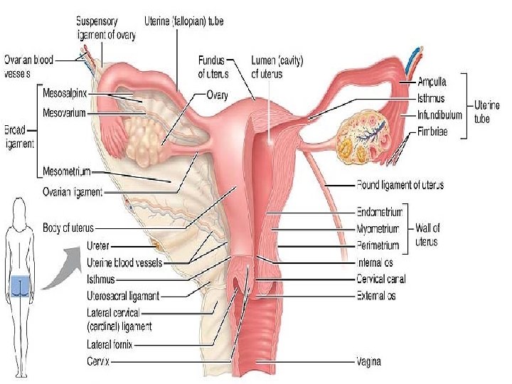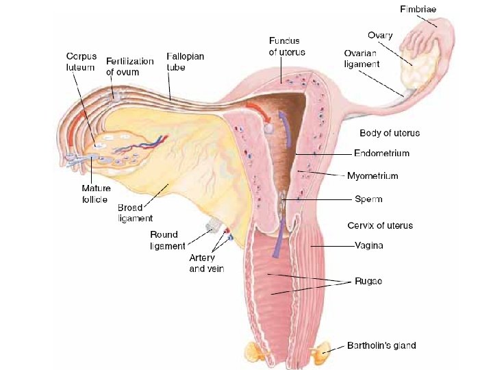 The Vagina The vagina is a thin-walled tube, 8– 10 cm long. It lies between the bladder and the rectum and extends from the cervix to the body exterior. The urethra is embedded in its anterior wall. • called the birth canal, the vagina provides a passageway for delivery of an infant and for menstrual flow. • The mucosa is a stratified squamous epithelium adapted to stand up to friction. The vaginal mucosa has no glands; it is lubricated by the cervical mucous glands. • The p. H of a woman’s vagina is normally quite acidic. This acidity helps keep the vagina healthy and free of infection, but it is also hostile to sperm.