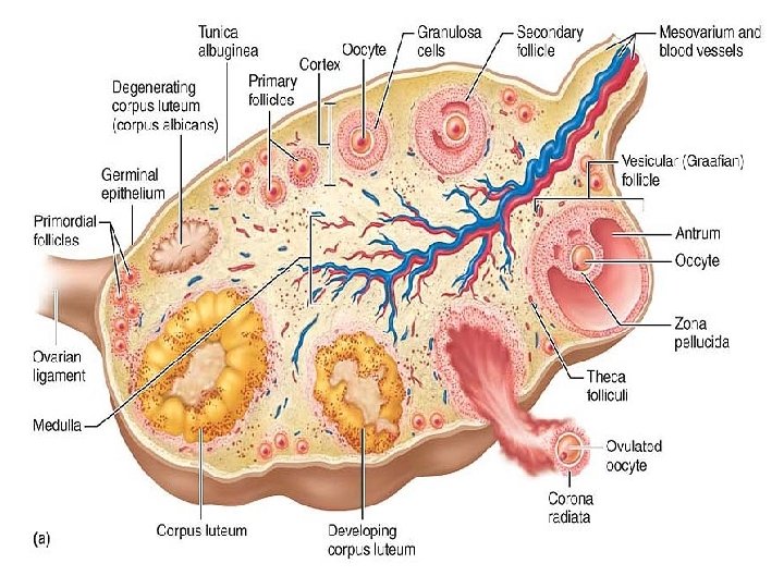 • Embedded in the highly vascular connective tissue of the ovary cortex are many tiny saclike structures called ovarian follicles. Each follicle consists of an immature egg, called an oocyte surrounded by one or more layers of very different cells called follicle cells. Follicles at different stages of maturation are distinguished by their structure. • A primordial follicle, one layer of squamouslike follicle cells surrounds the oocyte. • A primary follicle has two or more layers of cuboidal or columnar-type cells enclosing the oocyte; it becomes a secondary follicle when fluidfilled spaces appear and then coalesce to form a central fluid-filled cavity called an antrum.