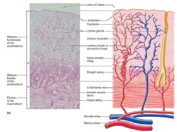 • The endometrium has two chief strata (layers): -The functional layer, undergoes cyclic changes in response to blood levels of ovarian hormones and is shed during menstruation (approximately every 28 days). -The thinner, deeper stratum basalis (ba-să′lis), or basal layer, forms a new functional layer after menstruation ends. It is unresponsive to ovarian hormones. -The endometrium has numerous uterine glands that change in length as endometrial thickness changes.