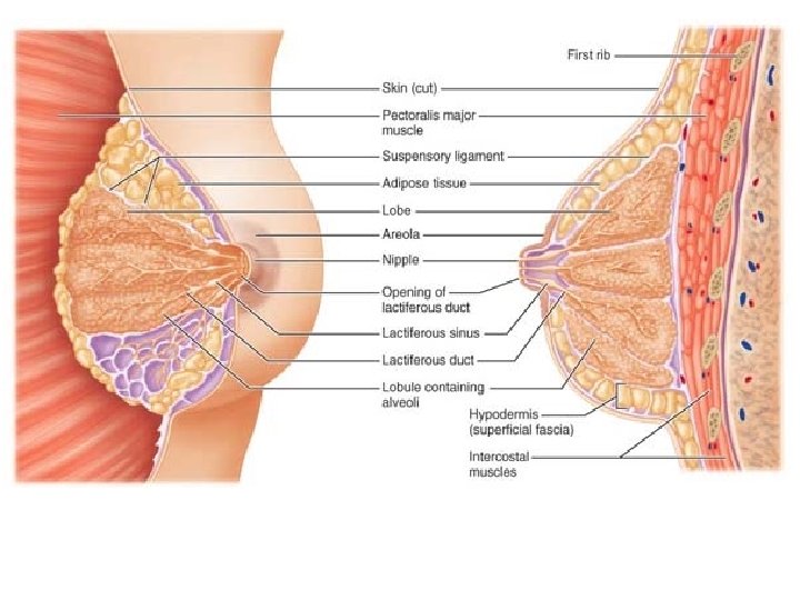 • Internally, each mammary gland consists of 15 to 25 lobes that open at the nipple. Within the lobes are smaller units called lobules, which contain glandular alveoli that produce milk when a woman is lactating. These compound alveolar glands pass the milk into the lactiferous ducts which open to the outside at the nipple. Just deep to the areola, each duct has a dilated region called a lactiferous sinus where milk accumulates during nursing. • In nonpregnant women, the glandular structure of the breast is largely undeveloped and the duct system is rudimentary; hence breast size is largely due to the amount of fat deposits.