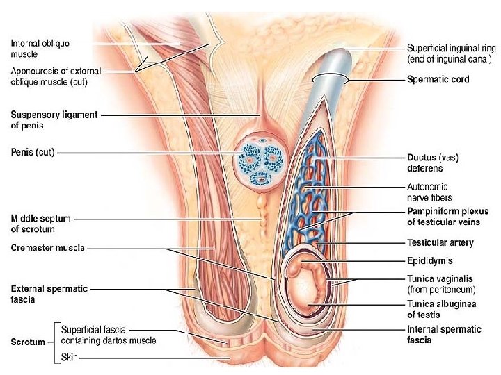 • Furthermore, the scrotum responds to temperature changes: • When it is cold, the testes are pulled closer to the warmth of the body wall, and the scrotum becomes shorter and heavily wrinkled, increasing its thickness to reduce heat loss. • When it is warm, the scrotal skin is flaccid and loose to increase the surface area for cooling (sweating) and the testes hang lower, away from the body trunk.