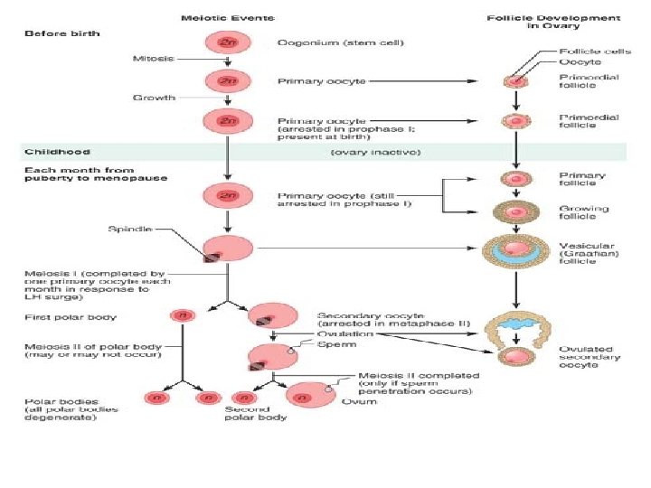 • At puberty, perhaps 250, 000 oocytes remain and beginning at this time a small number of primary oocytes are activated each month in response to the LH surge midcycle. However, only one is “selected” each time to continue meiosis I, ultimately producing two haploid cells (each with 23 replicated chromosomes) that are quite dissimilar in size. • The smaller cell is called the first polar body. The larger cell, which contains nearly all the cytoplasm of the primary oocyte, is the secondary oocyte.
