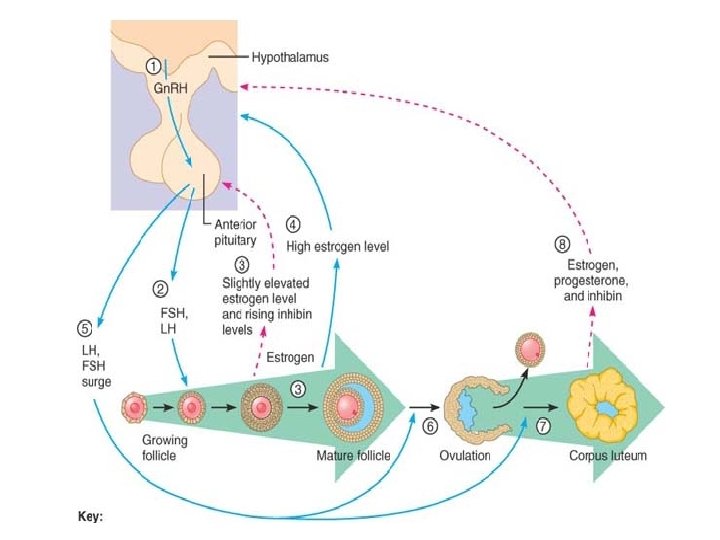 Hormonal Regulation of the Ovarian Cycle Establishing the Ovarian Cycle As puberty nears, the hypothalamus begins to release Gn. RH in a rhythmic manner which stimulates the anterior pituitary to release FSH and LH, which prompt the ovaries to secrete hormones (primarily estrogens). Gonadotropin levels continue to increase for about four years and, during this time, pubertal girls are still not ovulating and thus are incapable of getting pregnant. The young woman’s first menstrual period is referred to as menarche. • Usually, it is not until the third year postmenarche that the cycles become regular and all are ovulatory.
