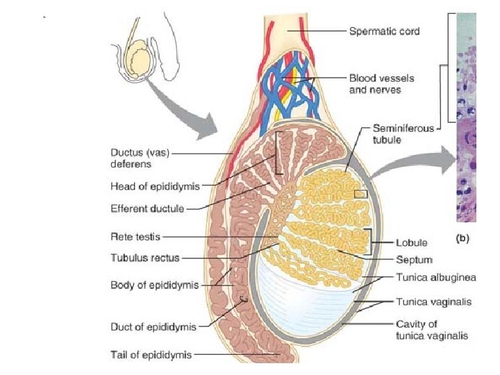 The Male Duct System In order (proximal to distal), the accessory ducts are : 1 -The Epididymis The cup-shaped epididymis is about 3. 8 cm long. Its head caps the superior aspect of the testis. Its body and tail are on the posterolateral area of the testis. It`s an uncoiled length is about 6 m. • The immature, nearly nonmotile sperm as it moves along its tortuous course (a trip that takes about 20 days), the sperm gain the ability to swim.
