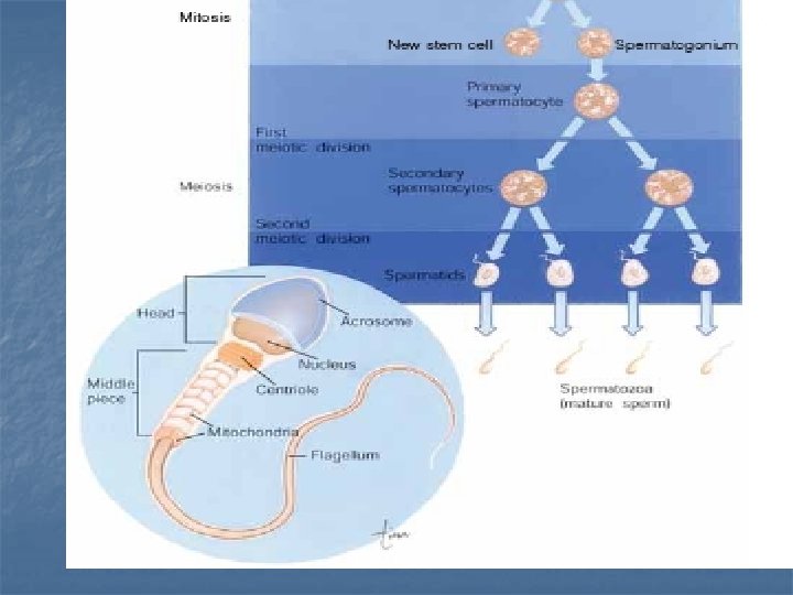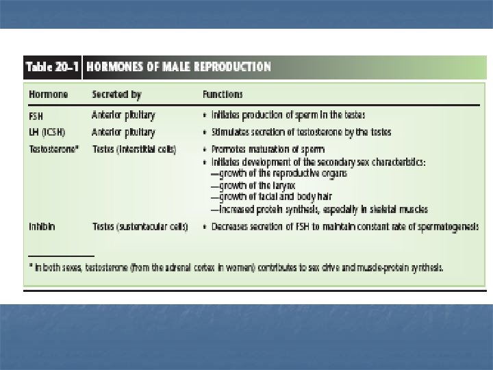 Role of Hormones n n Follicle-stimulating hormone (FSH) from the anterior pituitary gland initiates sperm production. Testosterone, secreted by the testes when stimulated by luteinizing hormone (LH) from the anterior pituitary, promotes the maturation of sperm. * Inhibin, also produced by the testes, decreases the secretion of FSH. For each primary spermatocyte, four