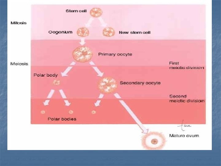 OOGENESIS Oogenesis is the process of meiosis for egg cell formation; n it is regulated by hormones: - FSH initiates the growth of ovarian follicles, each of which contains an oogonium, a stem cell for egg cell production. This hormone also stimulates the follicle cells to secrete estrogen, which promotes the maturation of the ovum. n