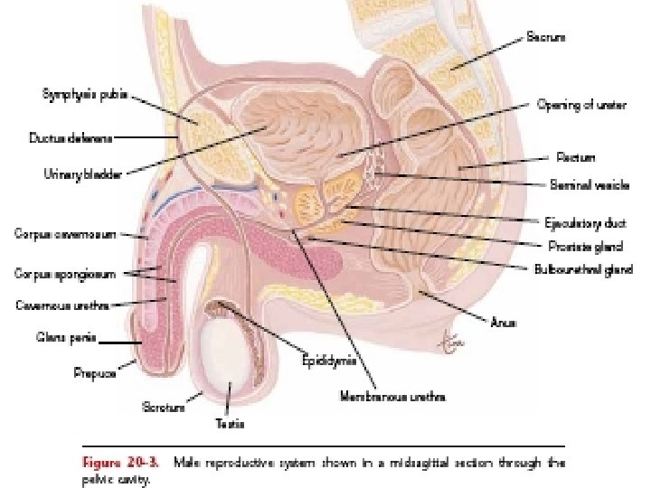 MALE REPRODUCTIVE SYSTEM The male reproductive system consists of n 1 - two testes n 2 - series of ducts : epididymis, ductus deferens, ejaculatory duct, and urethra. n 3 - the reproductive glands: seminal vesicles, prostate gland, and bulbourethral glands. n