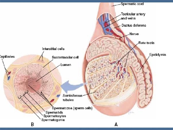 Testis n n n Each testis is about 1. 5 inches long by 1 inch wide (4 cm by 2. 5 cm) and is divided internally into lobes Each lobe contains several seminiferous tubules, in which spermatogenesis takes place. Among the spermatogonia of the seminiferous tubules are sustentacular (Sertoli) cells, which produce the hormone inhibin when stimulated by testosterone.