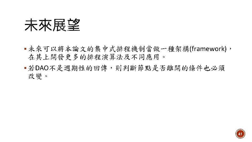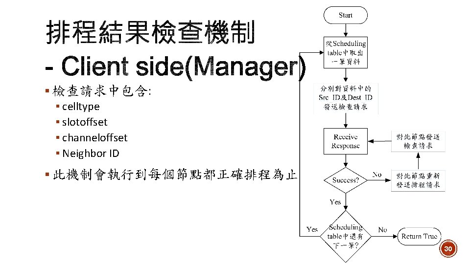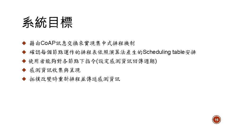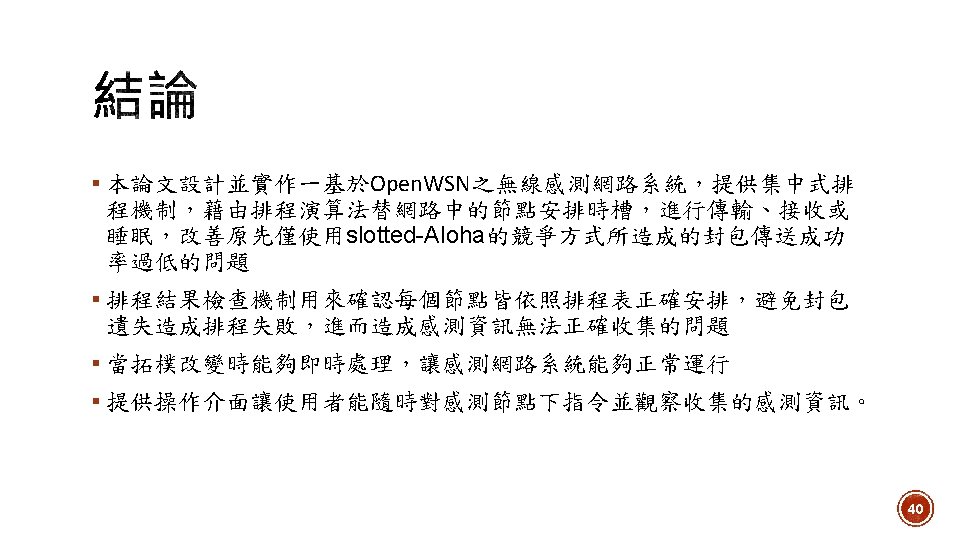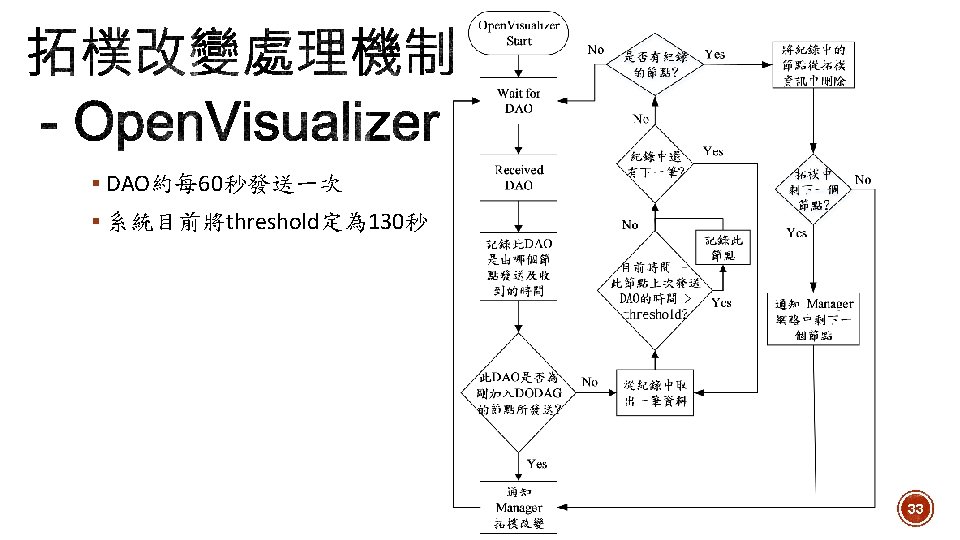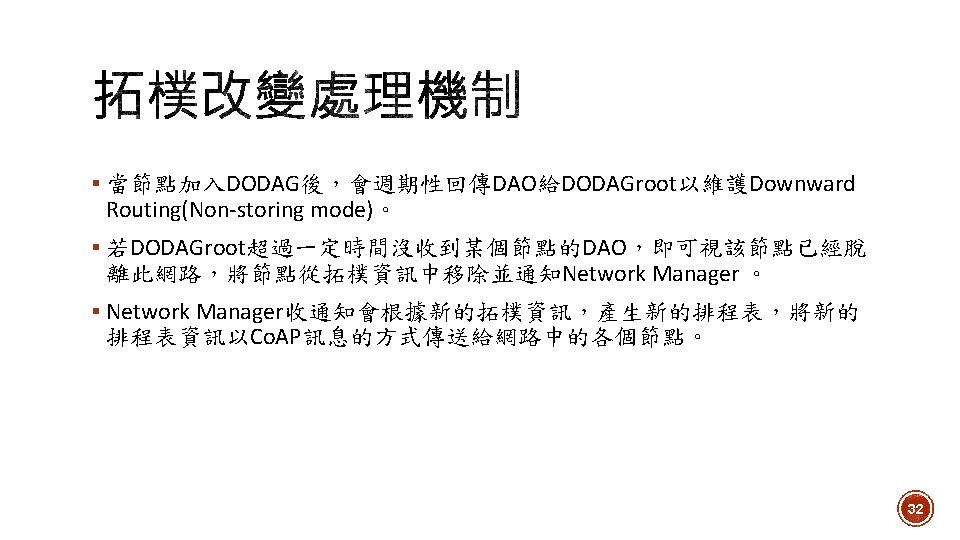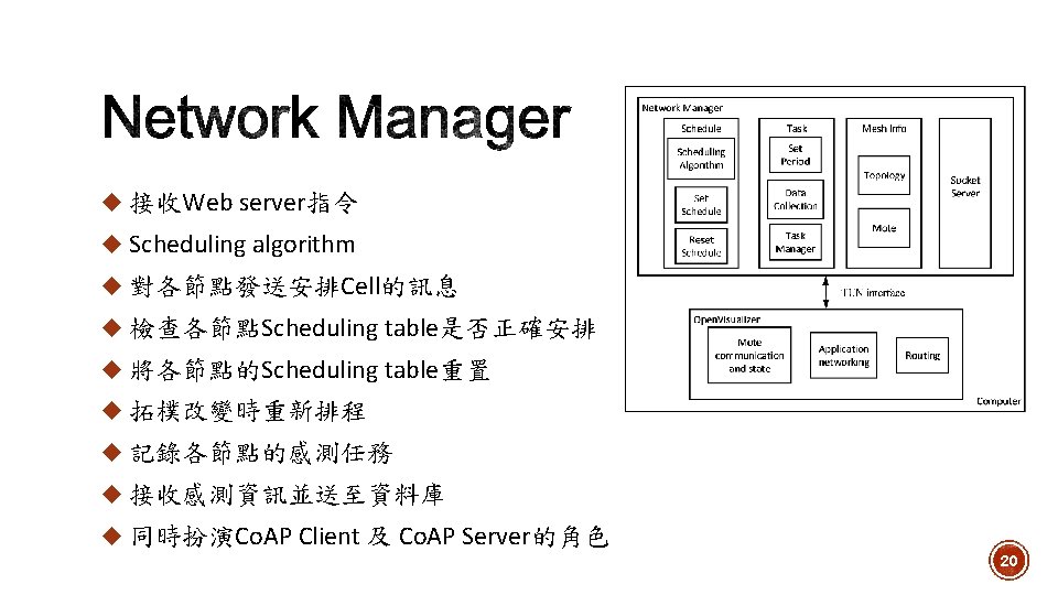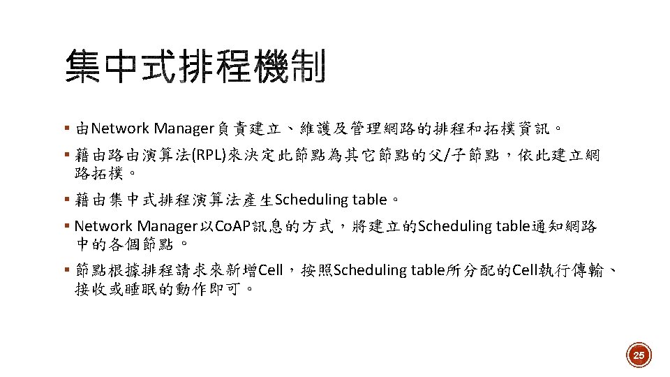 1. Toggle DAGroot state 2. Network Formation Open. Visualizer 3. Routing 4. Scheduling 5. Set sensor period 6. Data collection Network Manager 7. 拓樸改變時重新排程 23