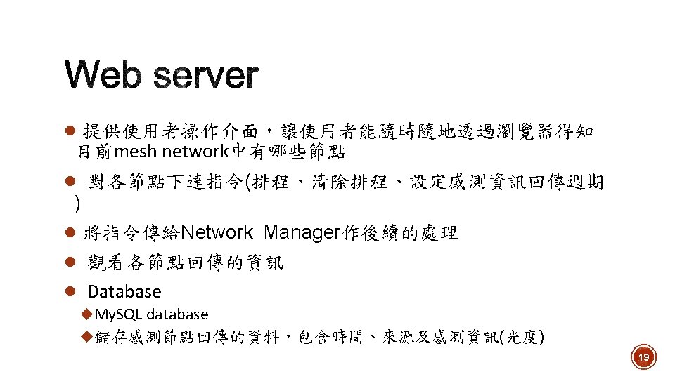u Web Server u Database u Network Manager u Open. Visualizer u Sensor Nodes(Tmote Sky) 18