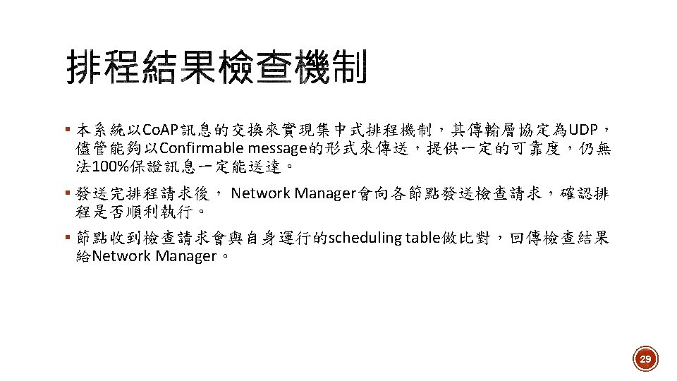 運行Co. AP應用程式來處理由Network Manager發送過來的請求(排程、檢 查排程表、設定感測資訊回傳週期) 根據Request增加Cell( slotoffset, channeloffset, celltype, neighbor address) 根據Request檢查Cell是否正確安排,並回傳檢查結果給Network Manager 根據Request設定感測資訊回傳週期 週期性傳送感測資訊給DODAGroot 同時扮演Co. AP Client 及 Co. AP Server的角色 22