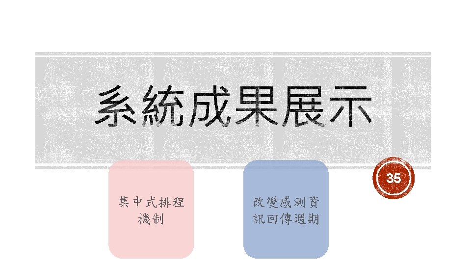 集中式排程機制 Client side Server side 排程結果檢查機制 Client side Server side 拓樸改變處理機制 Open. Visualizer Network Manager 24