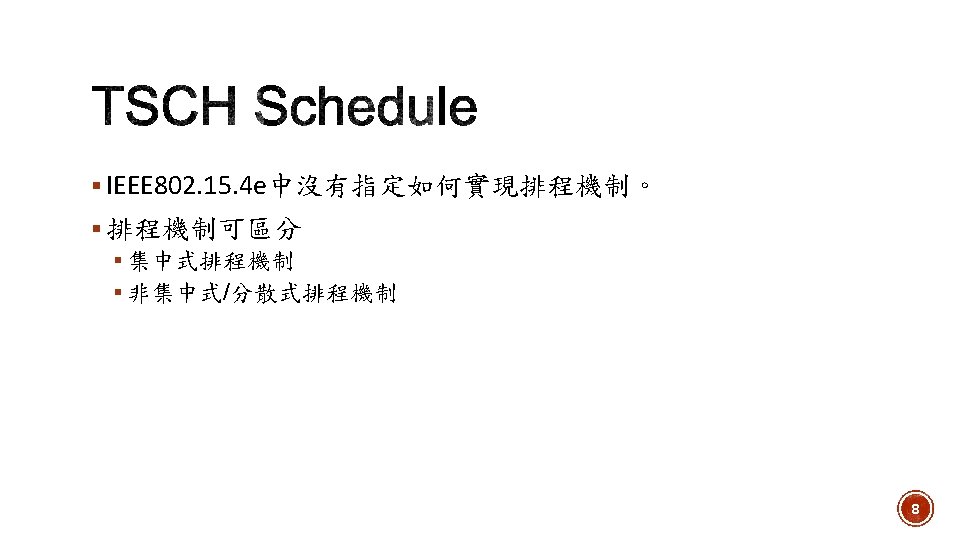 Time slotted channel hopping(TSCH) combines: § Time slotted access § Shared and Dedicated Slots § Multi-channel communication § Channel hopping 7