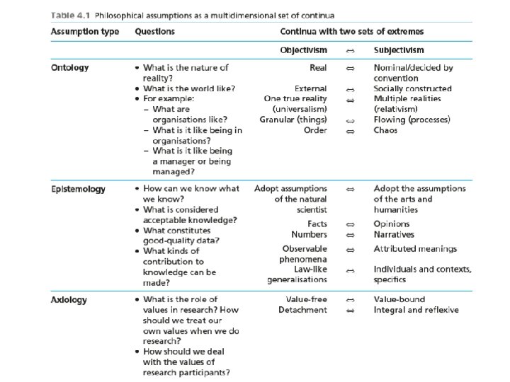 Ontology • It refers to assumptions about the nature of reality. • The way you see and study your research objects (organizations, management, artefacts etc. ).